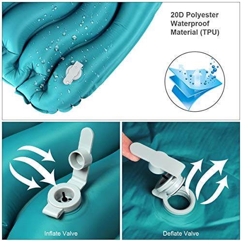 【Eenvoudig opblazen en ontluchten】 Dit luchtkussen onderscheidt zich van andere luchtkussens die voor het opblazen moeten inademen. De airbag maakt het eenvoudig opblazen van het kussen mogelijk en bespaart tijd en energie. Let op: nadat je slaapzak volledig is opgeblazen, controleer dan of beide ventielen voor gebruik goed gesloten zijn.