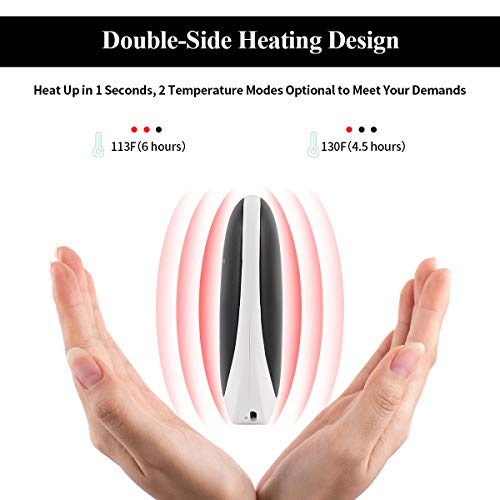 【Dubbelzijdige en constante temperatuur】 Druk lang op de AAN / UIT-knop, pas de temperatuur met twee snelheden aan, de dubbele kant van de handwarmers zal binnen 5 seconden opwarmen. Lage temperatuur: ongeveer 45 ° C / 113 ° F; Hoge temperatuur: ongeveer 55 ° C / 131 ° F. U kunt de optimale kookstand kiezen voor uw comfort.