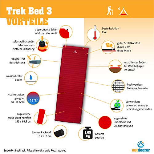 Specification: outdoorer Zelfopblaasbare slaapmat Trek Bed 3 in rood – camping en trekking isomat, zelfopblazend, 5 cm hoog, licht en…