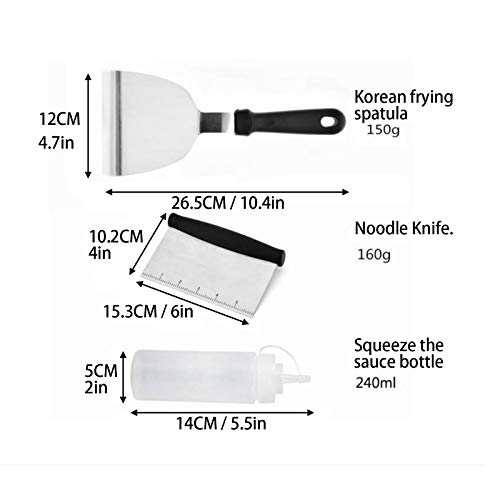 – 12-in-1 professionele grillset: uitgerust met 5 spatels voor verschillende doeleinden, 2 eiermodellen, 1 grillclip, 1 grillborstel, 1 noedelmes en 2 stuks 240 ml plastic knijpflessen. Een complete koekenpan en grillpanset kunnen aan verschillende kookdoeleinden voldoen.